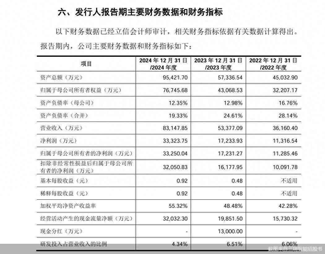 冲击上市背后,三瑞智能也有着较强的业绩底气。财务数据显示,2022—2024年,三瑞智能实现营业收入分别约为3.62亿元、5.34亿元、8.31亿元;对应实现归属净利润分别约为1.13亿元、1.72亿元、3.33亿元;对应实现扣非后归属净利润分别约为1.01亿元、1.62亿元、3.21亿元。
