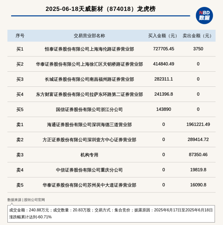 每经讯,2025年6月18日,新三板创新层公司天威新材(874018,收盘价:9.9元)登上龙虎榜,交易方式是集合竞价,披露原因是2025年6月17日至2025年6月18日涨跌幅累计达到-60.71%,成交数量20.83万股,成交金额240.88万元。买一席位为恒泰证券股份有限公司上海海伦路证券营业部中国股票配资网官网,买入72.77万元;卖一席位为海通证券股份有限公司深圳海德三道营业部,卖出196.12万元。